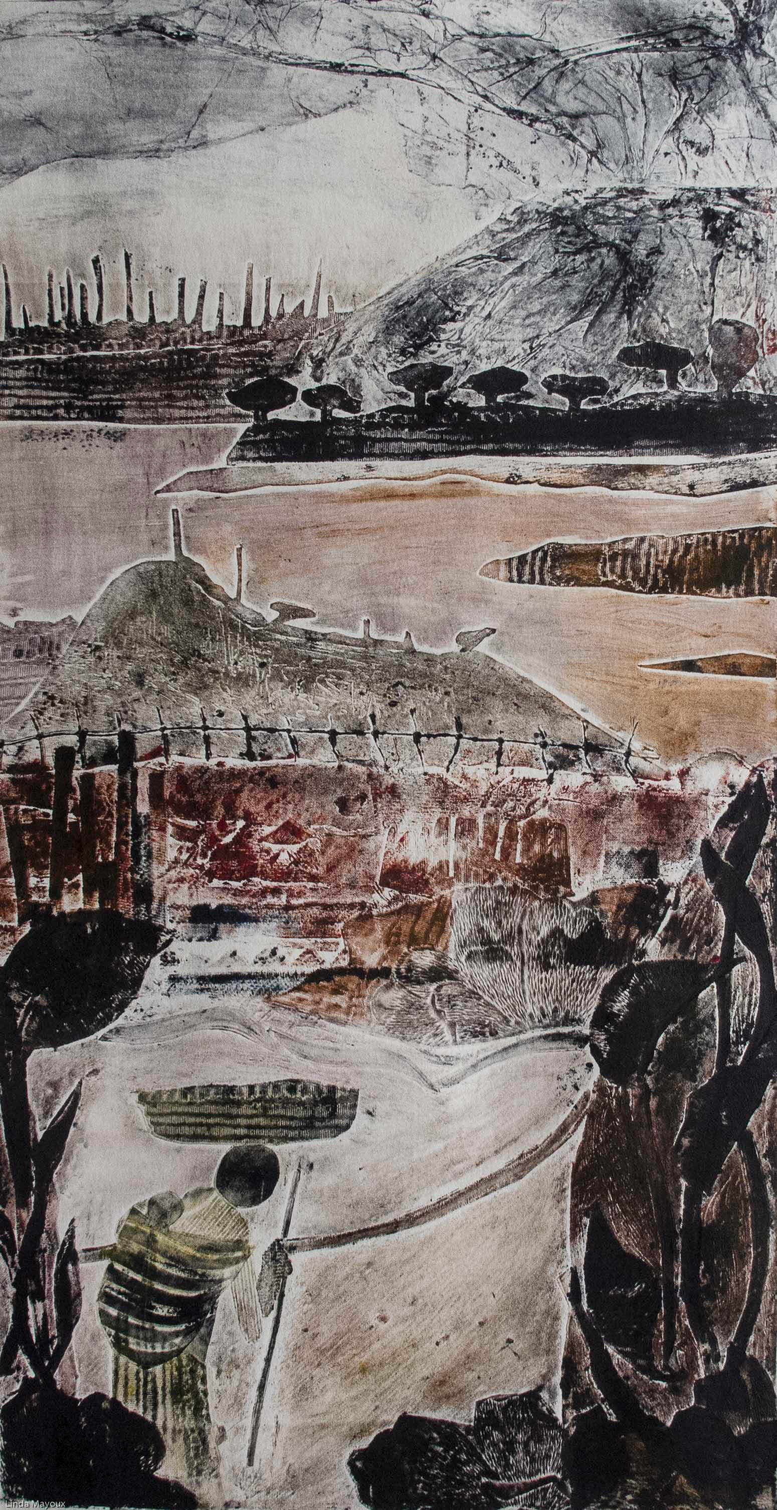 The plate is composed in roughly three sections: foreground with the woman and baby weary of walking (like so many of the people I had seen on the road), middle section of the charred remains of the city and the volcano at the top. With a half-way line of the fence. The sections are linked by the curve of the road that links to the curve of the islands and image at the top. There is no definite focal point – the eye travels up and down trying to make sense of the relationship between the elements. The plate uses a range of materials including plastic netting, tissue paper, card and different wallpapers and fabrics.
